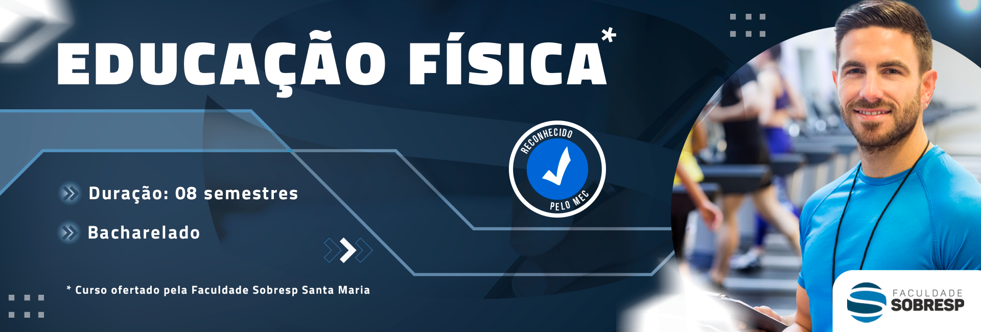 O curso de Bacharelado em Educação Física da SOBRESP é oferecido na modalidade EaD com três encontros presenciais semanais, que possibilitam a integração entre a flexibilidade do ambiente virtual de aprendizagem e a vivência prática nos espaços laboratoriais e esportivos da instituição.