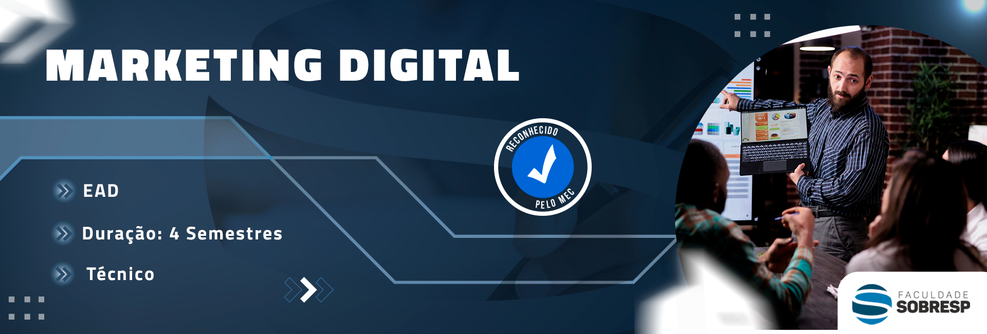 O Curso Superior de Tecnologia em Marketing Digital da SOBRESP tem por objetivo geral formar tecnólogos em Marketing Digital, criativos e inovadores, aptos a atuarem estrategicamente no ambiente online, com habilidades para identificar, planejar, implementar e controlar ações de marketing que potencializem a presença digital e o melhor posicionamento das marcas.